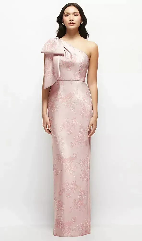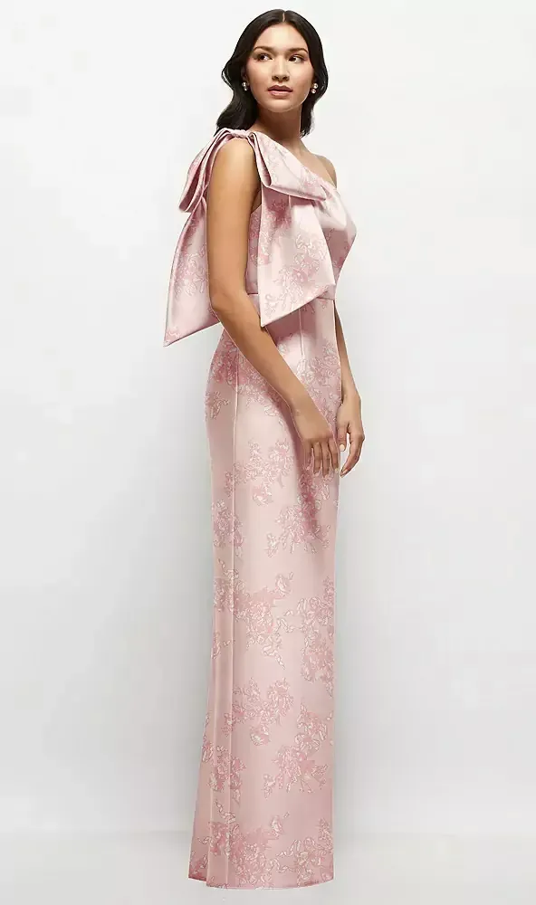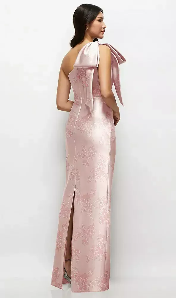 This stunning column maxi dress takes the chic factor up a notch with its gorgeous floral print, one-shoulder design, and smooth satin twill fabric. The massive, handcrafted bow on the shoulder is the standout, turning heads and adding a dash of drama. Plus, there's a center slit at the back, so you can hit the dance floor without anything holding you back. If you're all about rocking effortless style with a hint of boldness and fun, this satin column dress with its enchanting florals is your go-to.