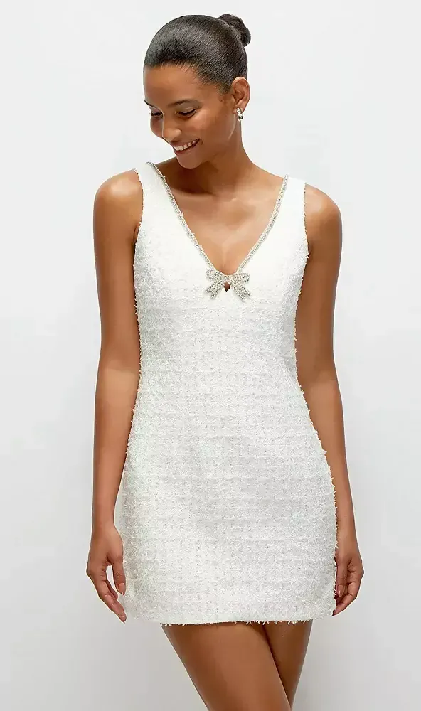 This Luxe Bridal Tweed mini sheath dress is the perfect blend of retro-meets-modern for the bride ready to bring some mod-inspired glam to her big day. The v-neckline, with its rhinestone trim and dainty bow, adds a perfect kiss of sparkle, while the sleeveless cut and sheath silhouette keep things sleek and effortlessly cool. The textured ivory shimmer tweed fabric brings in that vintage-glam feel, but the whole vibe stays fresh and forward-thinking. Expertly mixing old-school glam with a sleek, modern feel, this little white mini dress is made for celebrating unforgettable bridal moments, from your bachelorette party to the after-party.