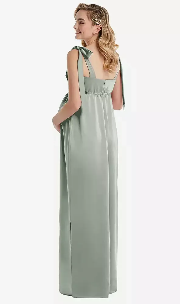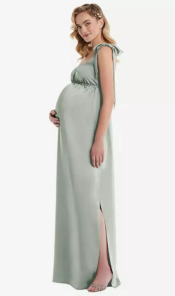 Accommodate the mother-to-be in your wedding party with this gorgeous lux charmeuse maternity bridesmaid dress. A side slit, flexible waist, and the bow detail at shoulders give this gown a look of classic elegance while allowing maximum comfort. Pre-tied bow detail is tacked to shoulder strap and easily removed by a tailor.