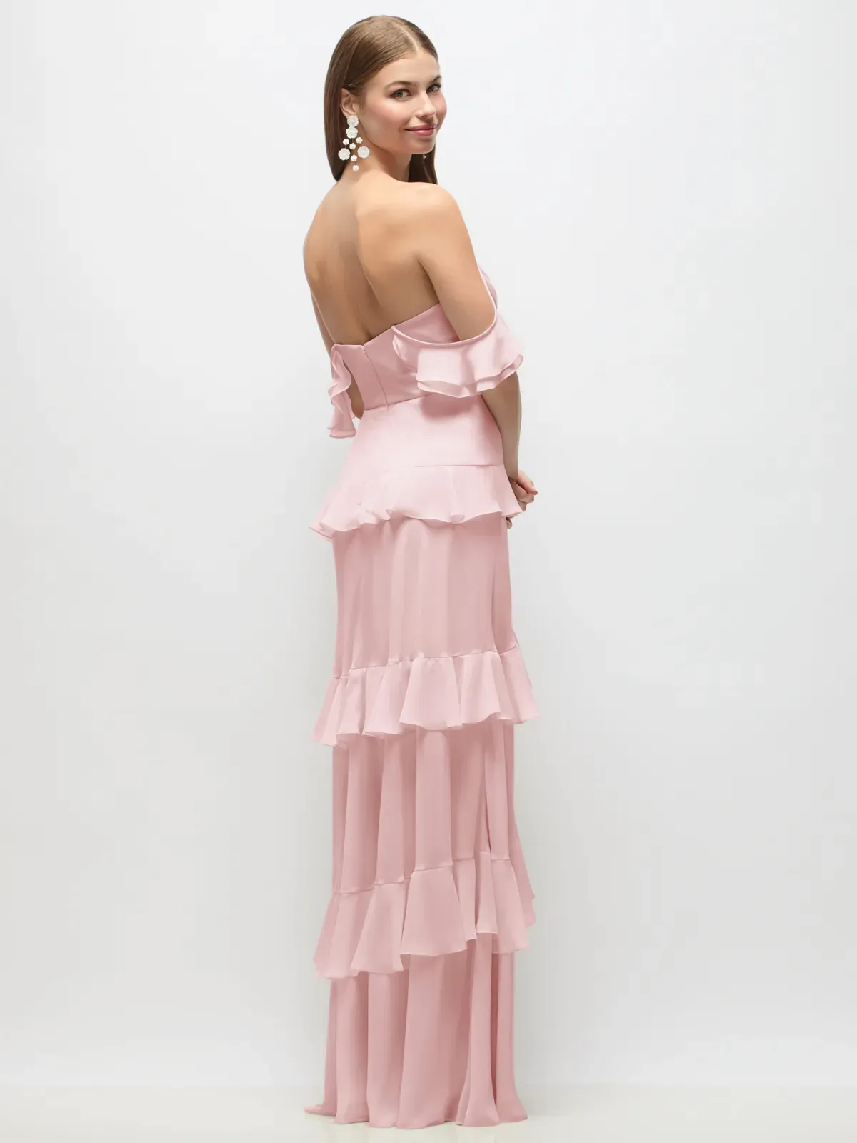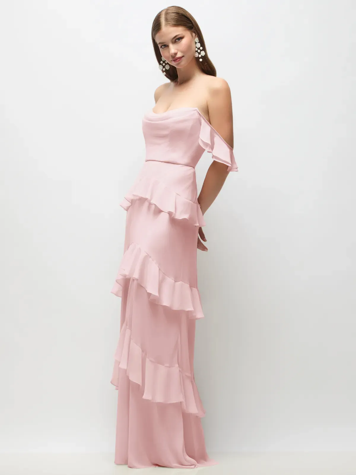 Full length Lux Chiffon Print dress with draped cowl bodice and ruffle bias skirt. Convertible off-shoulder ruffle straps.