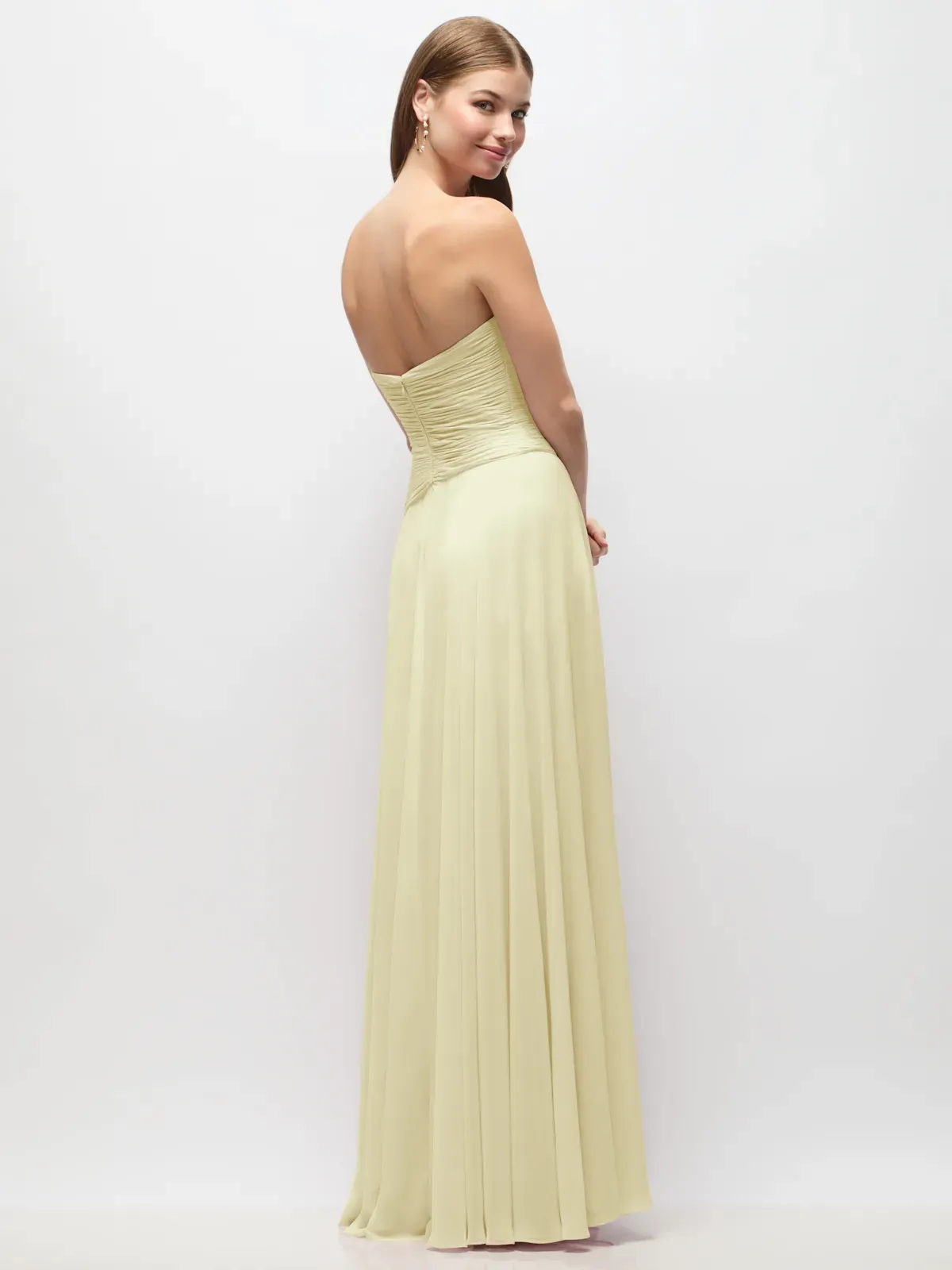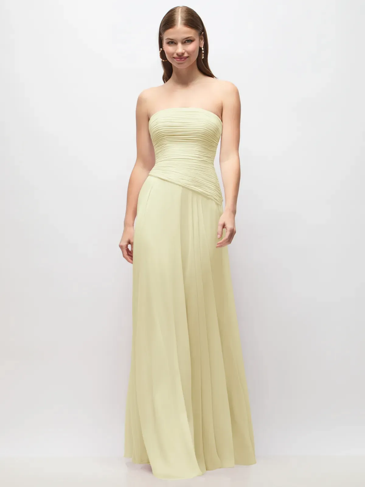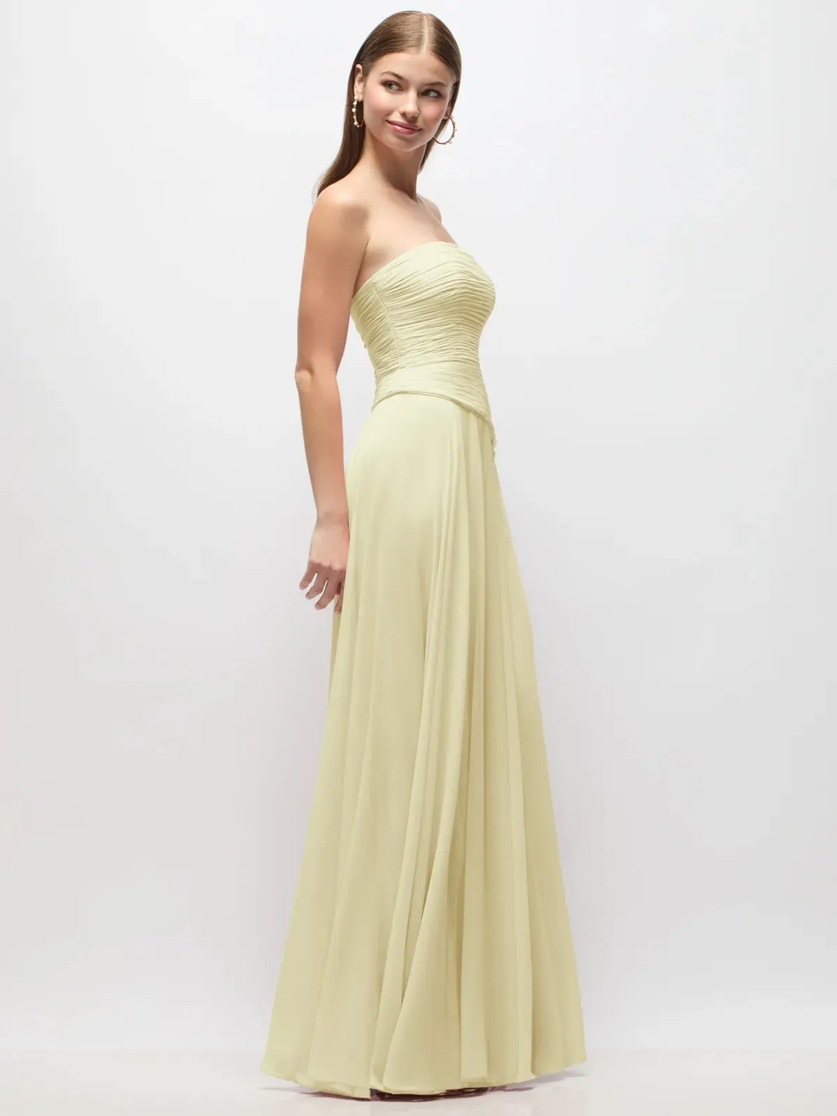 Full length strapless Lux Chiffon dress with ruched bodice and asymetrical drop waist. Circle skirt.