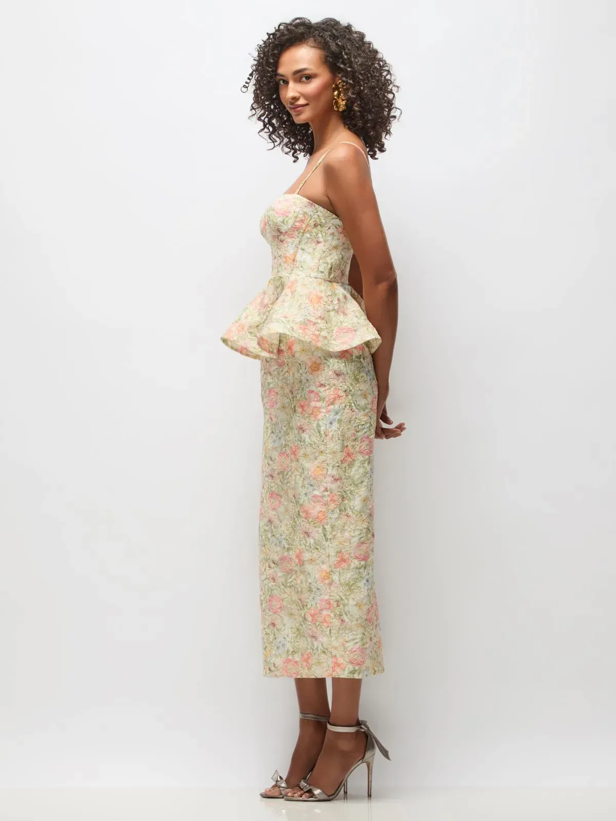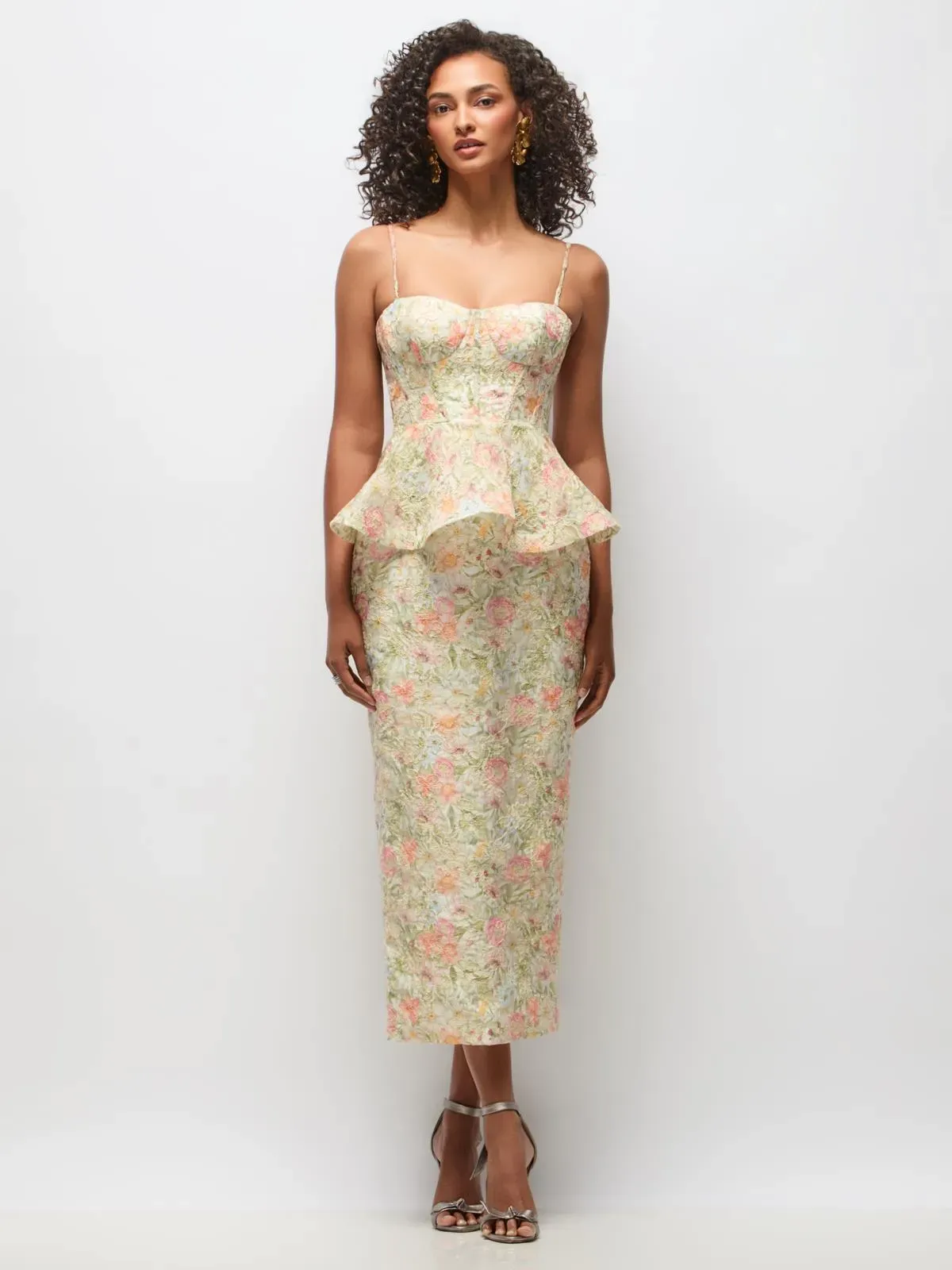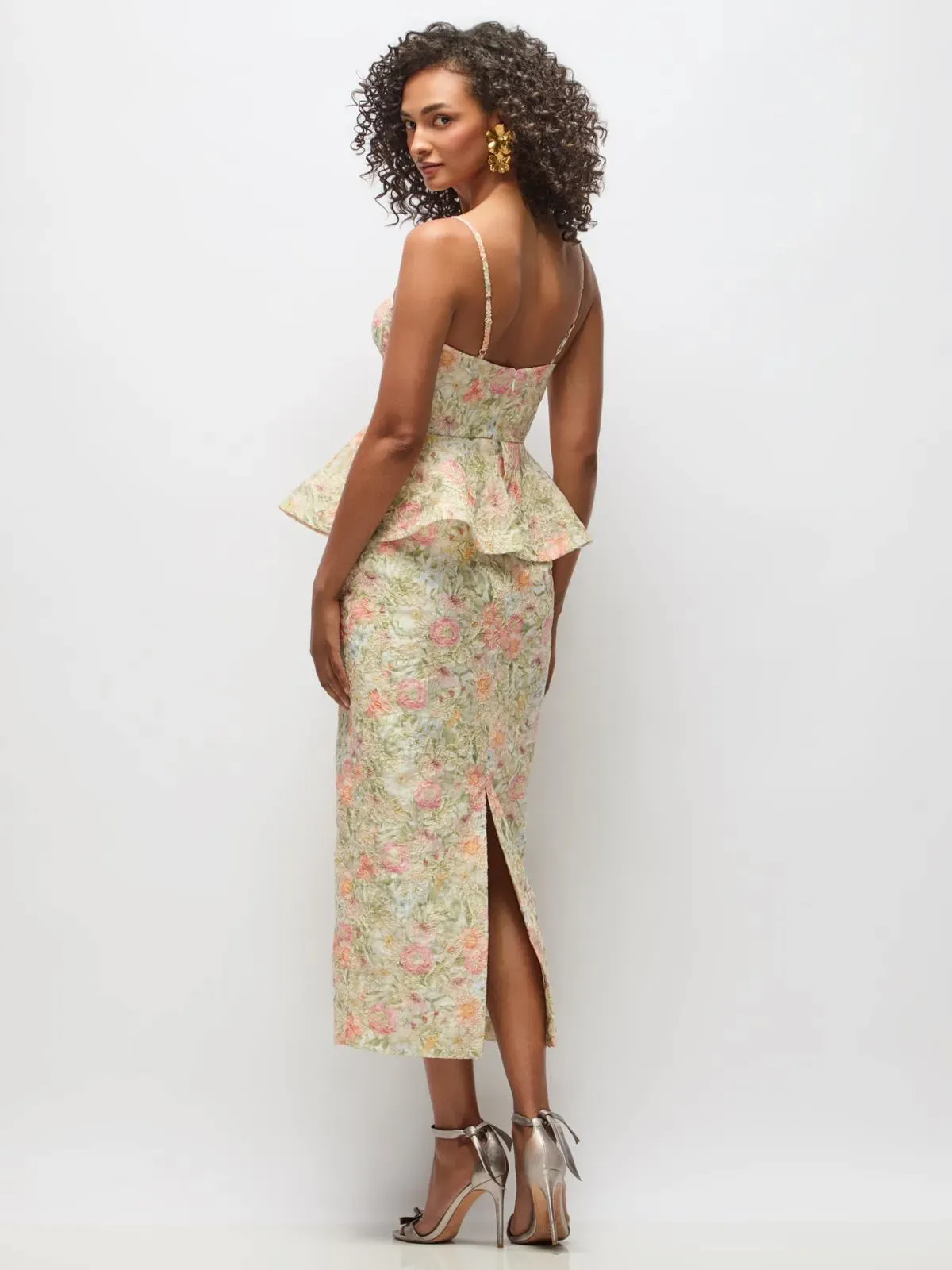 Tea length Wildflower Multi floral Re-Embroidered Voile dress with boned bustier bodice. Peplum over column skirt.