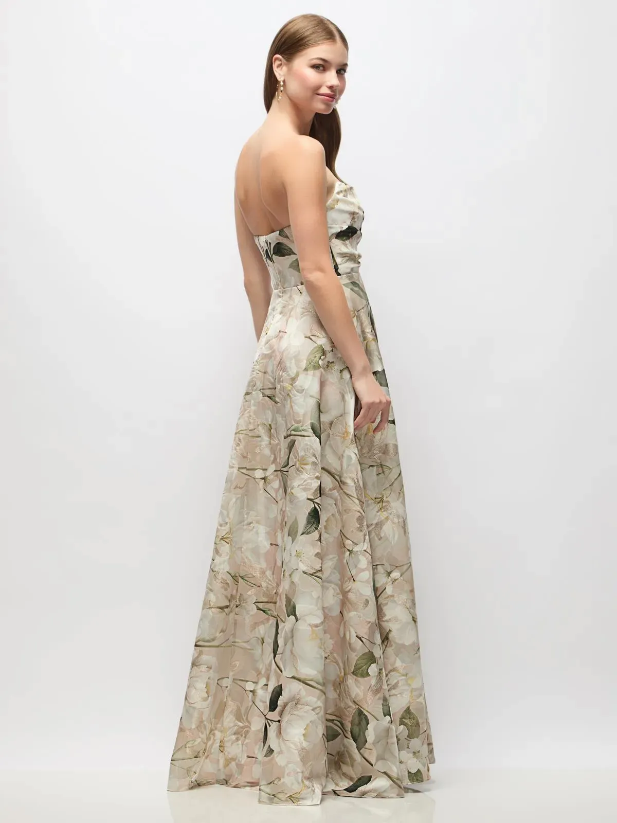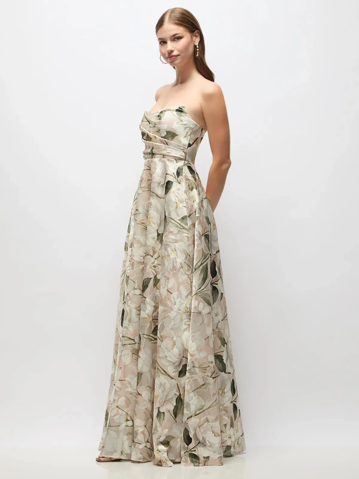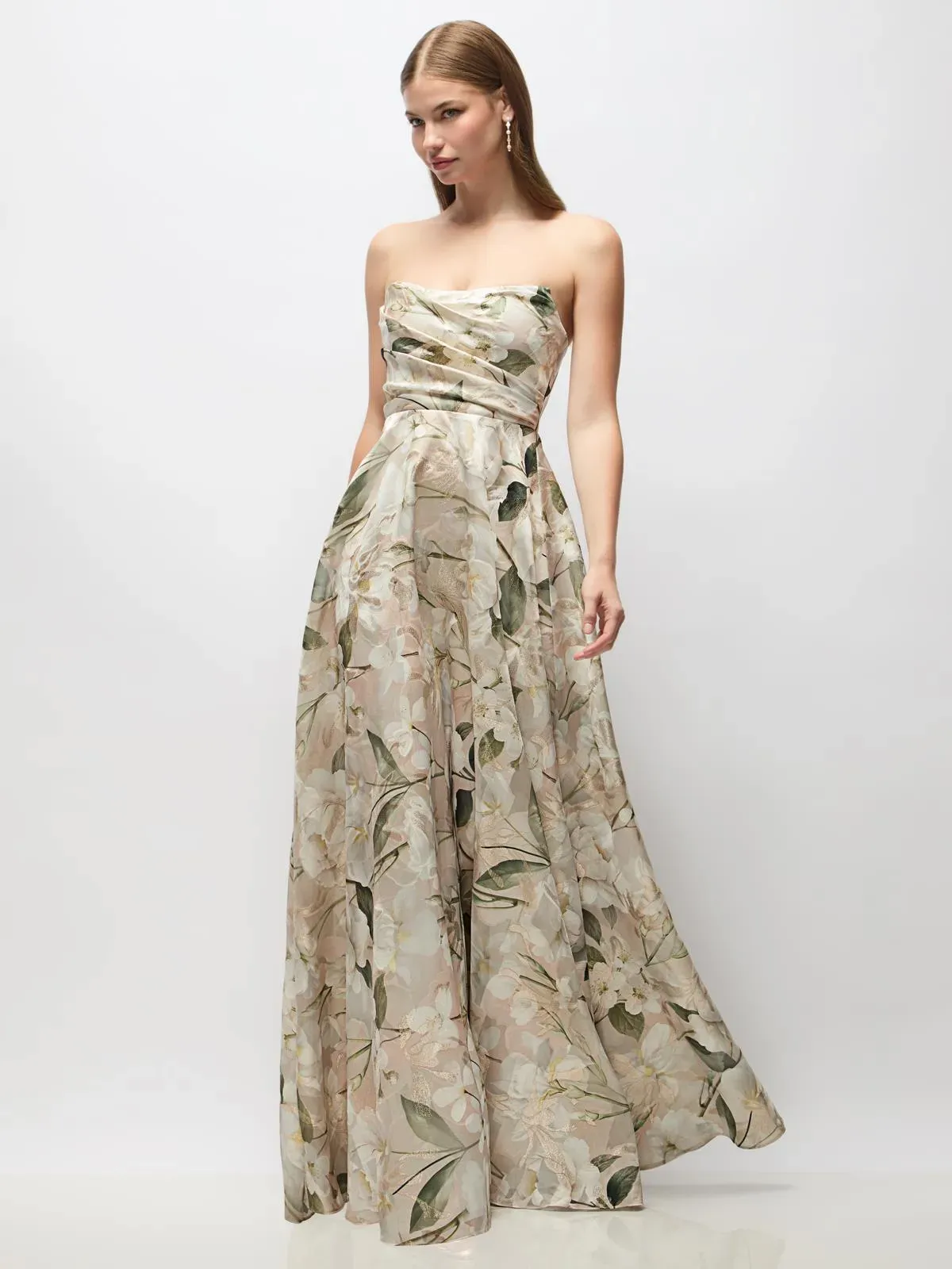 Full length strapless Plumeria Floral Metallic Organza Jacquard dress with draped cat eye bodice and circle skirt.