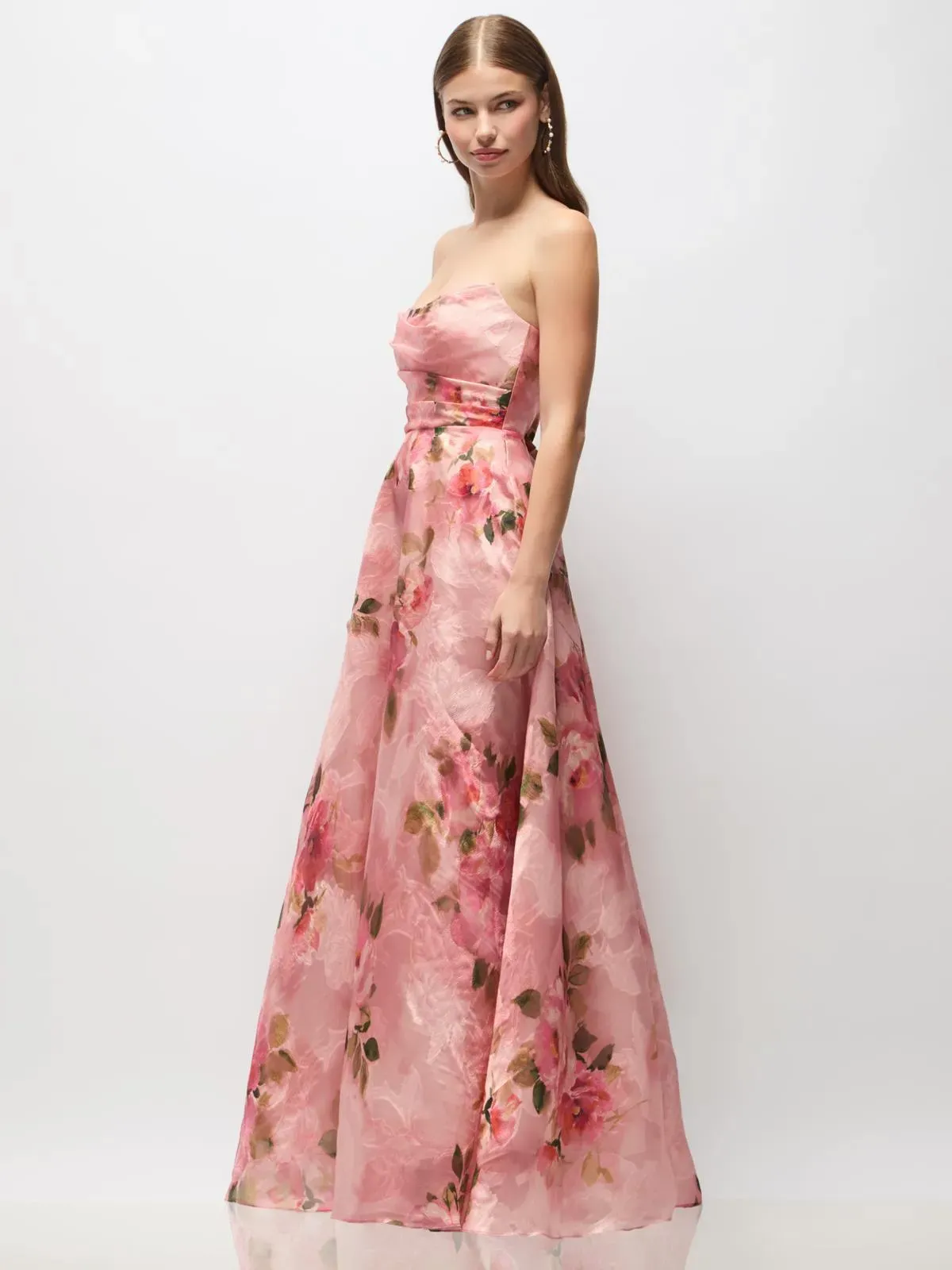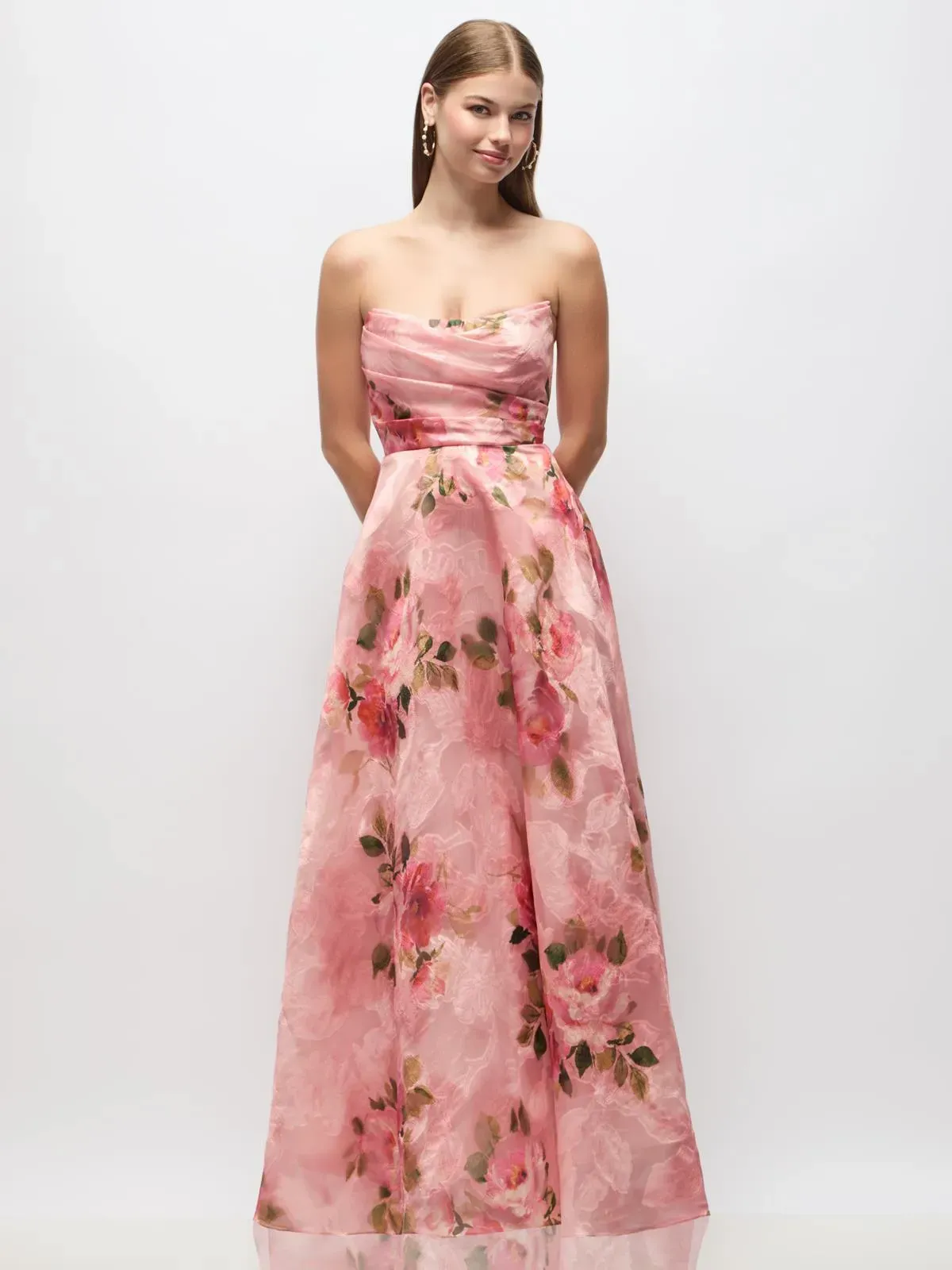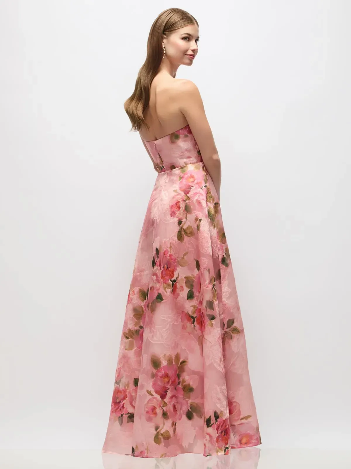 Full length strapless Guava Floral Organza Jacquard dress with draped cat eye bodice and circle skirt.