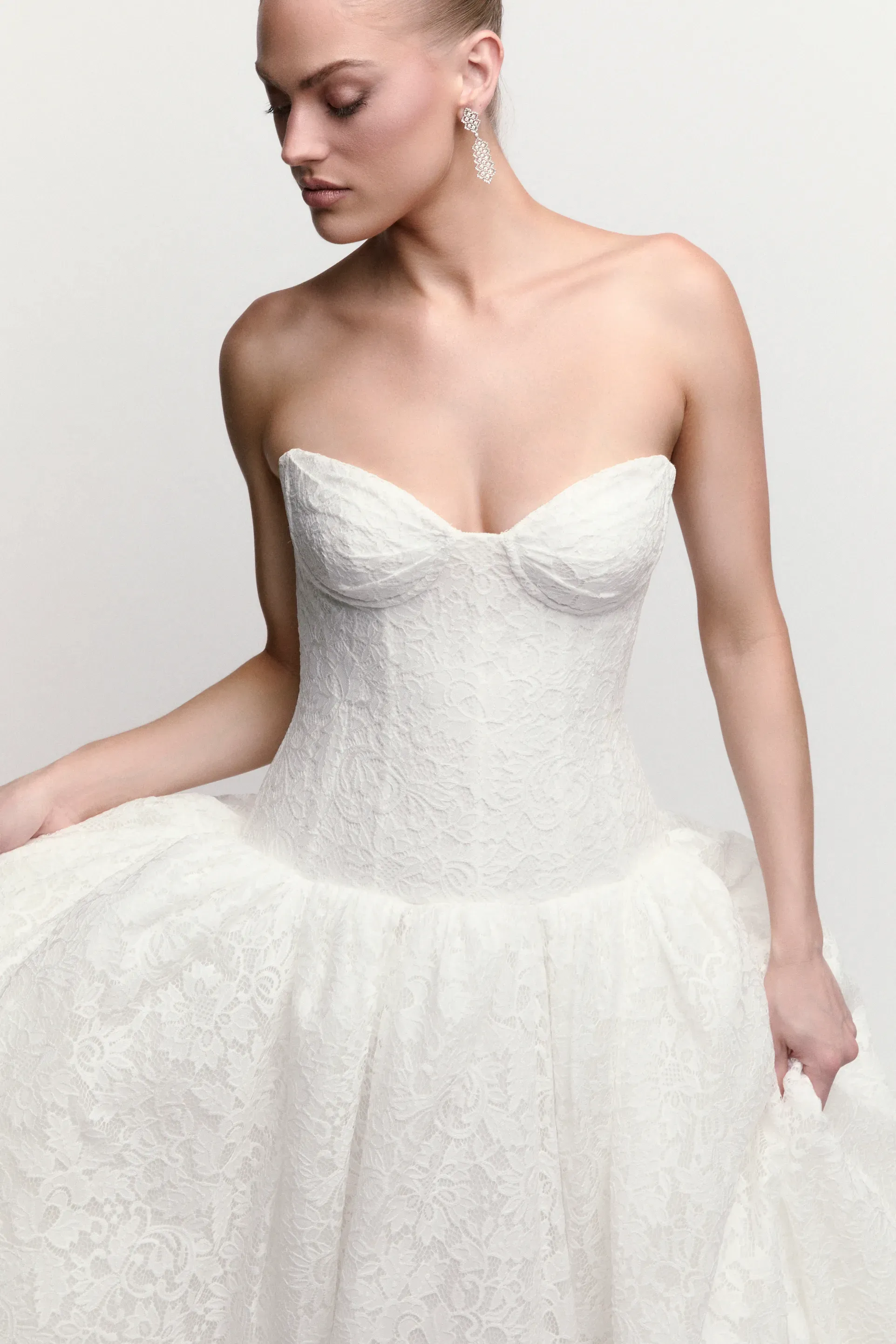 Fabric:Dotted Netting, Rococo Floral Lace, Soft netting, Stretch Poly Charmeuse, Tulle